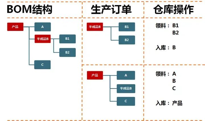 5、BOM断阶原则 企业里的产品和材料都好识别及整理,但半成品比较难确定,涉及到库存管理方式、计划管理方式、生产管理方式、成本核算方式等。 一般而言,一个产品每多一BOM阶层结点,就会在单据运作中多一次生产订单 --> 生产领料 --> 产品入库的循环 所以,BOM断阶最简单的方法是半成品是否入库,方便成本核算。