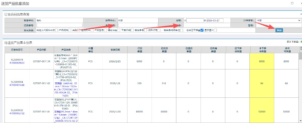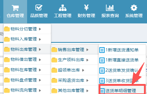 搜索需要出货的明细 可选择不同订单号的物料。选择之后如下图所示: 提交即可查询到对应的送货单;菜单为仓库管理-物料出库管理-销售出库管理-送货单明细管理:如下图所示: