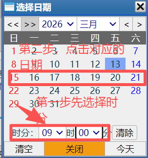 遇到此情况,需要我们在选日期时按以下步骤来填选,入下图所示:进入日期选择框时,按以下步骤选择,先选择时分字段,再点击日期字段,如下图所示:正确的选择后,如下图展现: