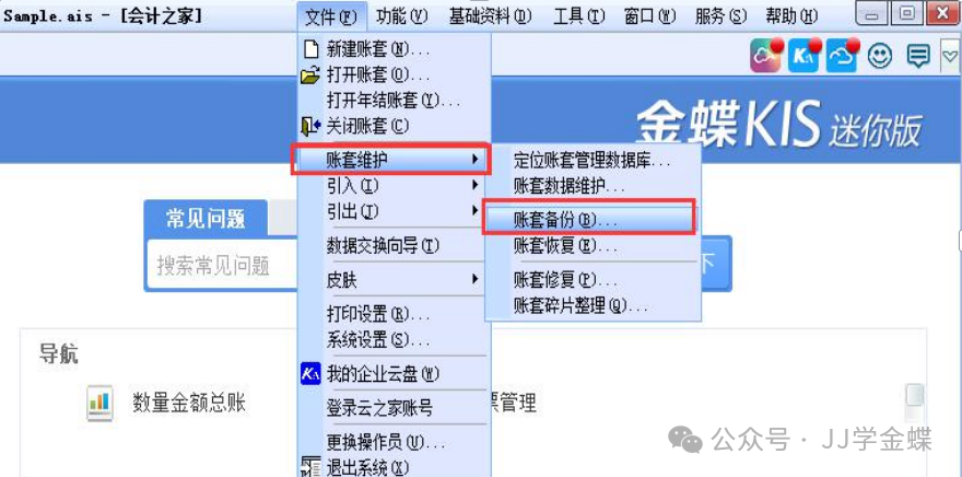 金蝶软件各版本备份操作流程:一、金蝶KIS迷你版/标准版备份账套:软件主界面右上角【文件】-【账套维护】-【账套备份】,选择备份账套保存位置,建议勾上【备份到企业云盘】,点击【备份】按钮,这样在本地路径和金蝶企业云盘中同时进行备份。二、金蝶KIS商贸版备份账套1、金蝶KIS商贸版6.1及先前版本的账套备份:开始-所有程...