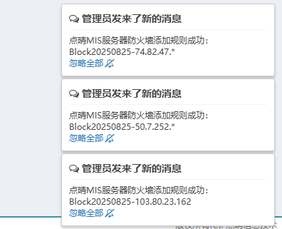 管理员身份登录到点晴MIS系统时,右下角弹出很多关于服务器添加或删除防火墙规则成功的提醒窗口,这是怎么回事?​​ 这是点晴OA系统安全性措施,检测到来访者有攻击行为时,就会将其IP加入Windows系统防火墙黑名单,彻底杜绝其继续攻击的行为。但这个IP不是永久封锁的,一般是7天后会释放,所以你会看到不断有新的IP被加...