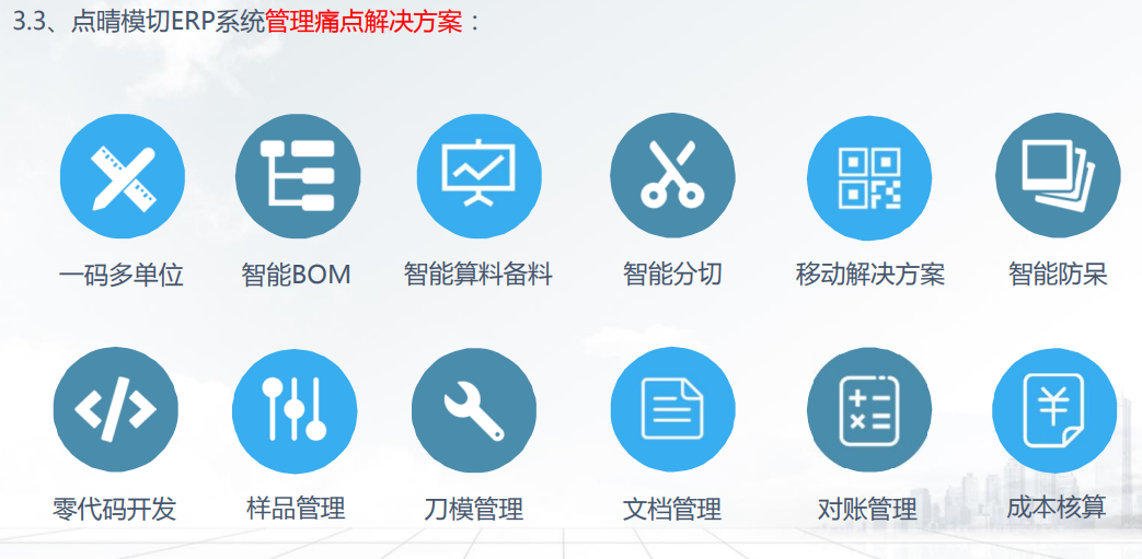 其实不管是模切行业还是其他行业,生产管理都是一大难题,有的企业不断投入更大的人力和财力,依然没能改善问题。通过应用点晴模切ERP系统,就可以实现闭环式生产管理流程,既能够提高整体的效率和品质,而且也能帮助模切其他完美解决管理上的痛点问题。其功能特色有以下几个: