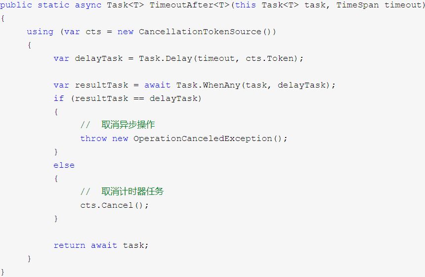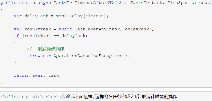 在异步编程时出现了一种模式cancelling an uncancellable operation,这个用于取消像CancellationTokenRegistry和timer这样的东西,通常是在被取消或超时时创建另外一个线程进行操作,然后使用Task.WhenAny进行判断是完成还是被取消了