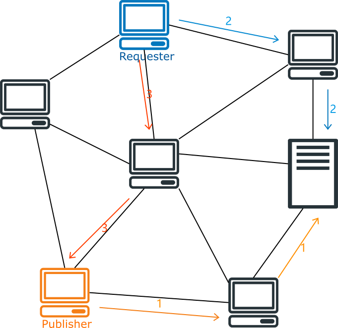 1. 引言相信没有人没使用过 P2P 技术. BT 种子和磁力链接就是最常见的 P2P 技术, 使用 P2P 技术, 文件不再需要集中存储在一台服务器上, 而是分散再各个用户的节点上, 每个人都是服务的提供者, 也是服务的使用者. 这样的系统具有高可用性, 不会由于一两台机的宕机而导致整个服务不可用. 那么这样一个系统是怎样实现的, 如何做到去中心化(decentralization)和自我组织(self-organization)的呢? 这篇文章我们来讨论一下这个问题. 这篇文章先会介绍 P2P 网络的整体思路, 并引出 P2P 网络的主角 - 分布式哈希表(Distributed Hash Table, DHT); 接着会介绍两种分布式哈希表算法. 这些会让你对 P2P 技术有一个较为具体的了解. 2. P2P 网络的概述2.1 传统 CS 网络和 P2P 网络CS 架构即 Client-Server 架构, 由服务器和客户端组成: 服务器为服务的提供者, 客户端为服务的使用者. 我们如今使用的很多应用程序例如网盘, 视频应用, 网购平台等都是 CS 架构. 它的架构如下图所示: 当然服务器通常不是一个单点, 往往是一个集群; 但本质上是一样的. CS 架构的问题在于, 一旦服务器关闭, 例如宕机, 被 DDoS 攻击或者被查水表, 客户端就无法使用了, 服务也就失效了. 为了解决这个问题, 人们提出了 P2P 网络(Peer-to-peer Networking). 在 P2P 网络中, 不再由中心服务器提供服务, 不再有”服务器”的概念, 每个人即使服务的提供者也是服务的使用者 – i.e., 每个人都有可能是服务器. 我们常用的 BT 种子和磁力链接下载服务就是 P2P 架构. 人们对 P2P 系统作了如下定义: