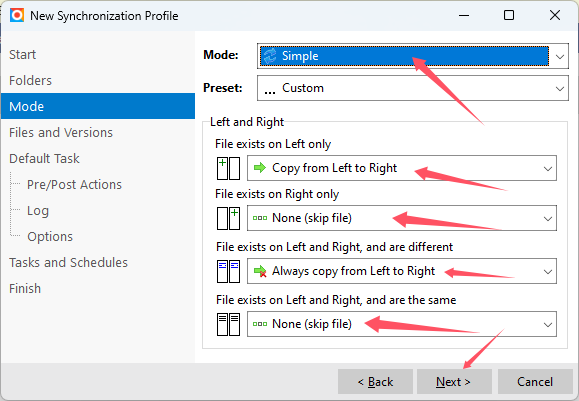 File exists on Left and Right, and are different,选择“Always copy from Left to Right”,意思是如果文件在两边都存在并且不同时,则永远只从左边复制到右边;
