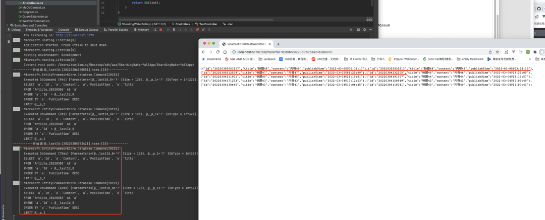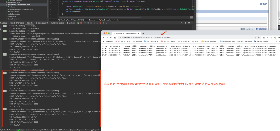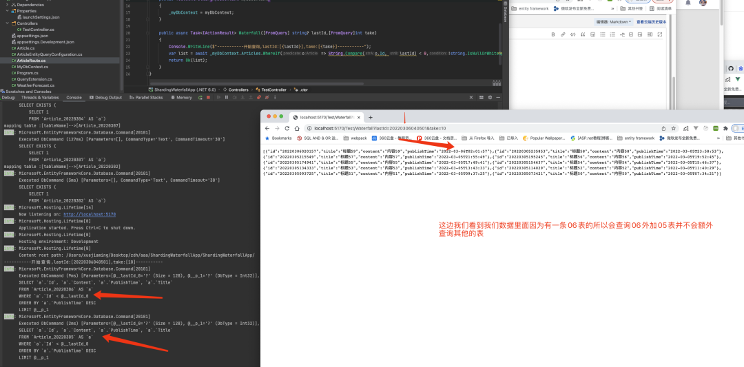 public class TailDayReverseComparer : IComparer <string > { public int Compare (string ? x, string ? y ) { //程序默认使用的是正序也就是按时间正序排序我们需要使用倒序所以直接调用原生的比较器然后乘以负一即可 return Comparer<string >.Default.Compare(x, y) * -1 ; } }//当前查询满足的复核条件必须是单个分片对象的查询,可以join普通非分片表 public class ArticleEntityQueryConfiguration :IEntityQueryConfiguration <Article > { public void Configure (EntityQueryBuilder<Article> builder ) { //设置默认的框架针对Article的排序顺序,这边设置的是倒序 builder.ShardingTailComparer(new TailDayReverseComparer()); /// /如下设置和上述是一样的效果让框架真对Article的后缀排序使用倒序 //builder.ShardingTailComparer(Comparer<string>.Default, false); //简单解释一下下面这个配置的意思 //第一个参数表名Article的哪个属性是顺序排序和Tail按天排序是一样的这边使用了PublishTime //第二个参数表示对属性PublishTime asc时是否和上述配置的ShardingTailComparer一致,true表示一致,很明显这边是相反的因为默认已经设置了tail排序是倒序 //第三个参数表示是否是Article属性才可以,这边设置的是名称一样也可以,因为考虑到匿名对象的select builder.AddOrder(o => o.PublishTime, false ,SeqOrderMatchEnum.Owner|SeqOrderMatchEnum.Named); //这边为了演示使用的id是简单的时间格式化所以和时间的配置一样 builder.AddOrder(o => o.Id, false ,SeqOrderMatchEnum.Owner|SeqOrderMatchEnum.Named); //这边设置如果本次查询默认没有带上述配置的order的时候才用何种排序手段 //第一个参数表示是否和ShardingTailComparer配置的一样,目前配置的是倒序,也就是从最近时间开始查询,如果是false就是从最早的时间开始查询 //后面配置的是熔断器,也就是复核熔断条件的比如FirstOrDefault只需要满足一个就可以熔断 builder.AddDefaultSequenceQueryTrip(true , CircuitBreakerMethodNameEnum.Enumerator, CircuitBreakerMethodNameEnum.FirstOrDefault); //这边配置的是当使用顺序查询配置的时候默认开启的连接数限制是多少,startup一开始可以设置一个默认是当前cpu的线程数,这边优化到只需要一个线程即可,当然如果跨表那么就是串行执行 builder.AddConnectionsLimit(1 , LimitMethodNameEnum.Enumerator, LimitMethodNameEnum.FirstOrDefault); } }第五步 添加配置到路由 public class ArticleRoute :AbstractSimpleShardingDayKeyDateTimeVirtualTableRoute <Article > { //省略..... public override IEntityQueryConfiguration<Article> CreateEntityQueryConfiguration () { return new ArticleEntityQueryConfiguration(); } }第六步 startup配置 var builder = WebApplication.CreateBuilder(args);// Add services to the container. ILoggerFactory efLogger = LoggerFactory.Create(builder => { builder.AddFilter((category, level) => category == DbLoggerCategory.Database.Command.Name && level == LogLevel.Information).AddConsole(); }); builder.Services.AddControllers(); builder.Services.AddShardingDbContext<MyDbContext>() .AddEntityConfig(o => { o.CreateShardingTableOnStart = true ; o.EnsureCreatedWithOutShardingTable = true ; o.AddShardingTableRoute<ArticleRoute>(); }) .AddConfig(o => { o.ConfigId = "c1" ; o.UseShardingQuery((conStr, b) => { b.UseMySql(conStr, new MySqlServerVersion(new Version())).UseLoggerFactory(efLogger); }); o.UseShardingTransaction((conn, b) => { b.UseMySql(conn, new MySqlServerVersion(new Version())).UseLoggerFactory(efLogger); }); o.AddDefaultDataSource("ds0" , "server=127.0.0.1;port=3306;database=ShardingWaterfallDB;userid=root;password=root;" ); o.ReplaceTableEnsureManager(sp => new MySqlTableEnsureManager<MyDbContext>()); }).EnsureConfig();var app = builder.Build(); app.Services.GetRequiredService<IShardingBootstrapper>().Start();using (var scope = app.Services.CreateScope()) { var myDbContext = scope.ServiceProvider.GetRequiredService<MyDbContext>(); if (!myDbContext.Articles.Any()) { List<Article> articles = new List<Article>(); var beginTime = new DateTime(2022 , 3 , 1 , 1 , 1 ,1 ); for (int i = 0 ; i < 70 ; i++) { var article = new Article(); article.Id = beginTime.ToString("yyyyMMddHHmmss" ); article.Title = "标题" + i; article.Content = "内容" + i; article.PublishTime = beginTime; articles.Add(article); beginTime= beginTime.AddHours(2 ).AddMinutes(3 ).AddSeconds(4 ); } myDbContext.AddRange(articles); myDbContext.SaveChanges(); } } app.MapControllers(); app.Run();第七步 编写查询表达式 public async Task<IActionResult> Waterfall ([FromQuery] string lastId,[FromQuery]int take ) { Console.WriteLine($"-----------开始查询,lastId:[{lastId} ],take:[{take} ]-----------" ); var list = await _myDbContext.Articles.WhereIf(o => String.Compare(o.Id, lastId) < 0 ,!string .IsNullOrWhiteSpace(lastId)).Take(take)..OrderByDescending(o => o.PublishTime)ToListAsync(); return Ok(list); }运行程序
