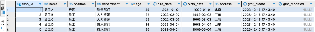 ('员工D', '员工', '技术部门', '35', '2022-04-04', '1998-03-04', '上海', NOW(), NULL);