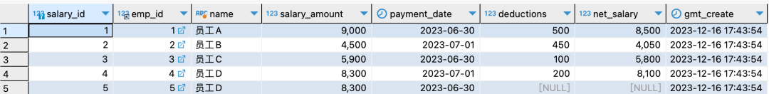 (5, '员工D', 8300.00, '2023-06-30', NULL, NULL, NOW());