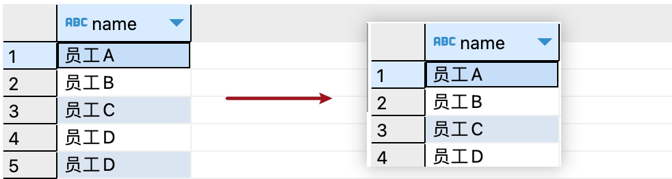 可以看到department的值是有重复的,这是因为DISTINCT其实是对后面所有列名的组合进行去重。也就是name+position+department+hire_date组合成的一行在整张表中都不重复的记录;在这里,因为name+position+department+hire_date有2个相同的数据,则过滤了一行。