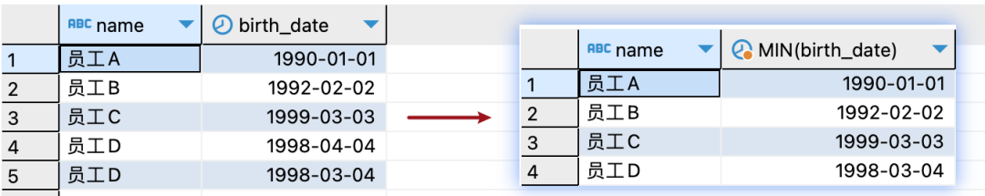 如果我们不仅想对name字段去重,还想获取每个员工的最早出生日期,可以这样写: