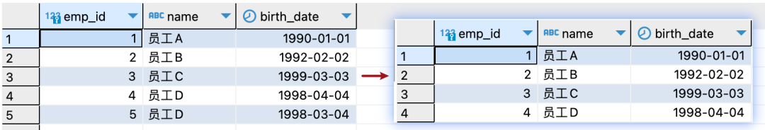 可以看到返回了emp_id值为5的员工信息,而不是emp_id为4的员工信息。