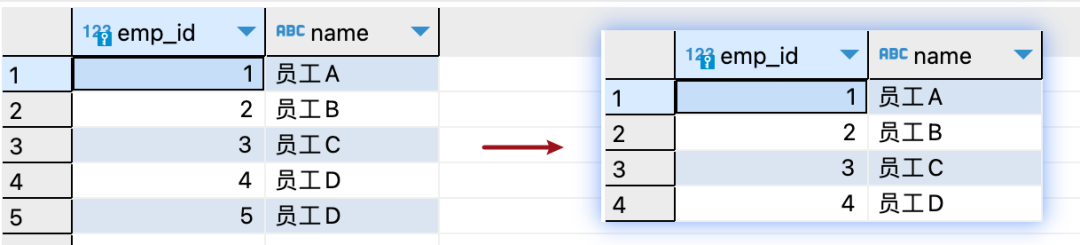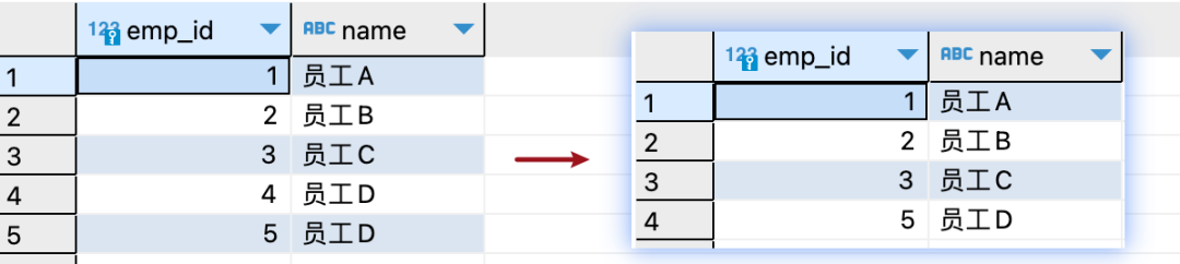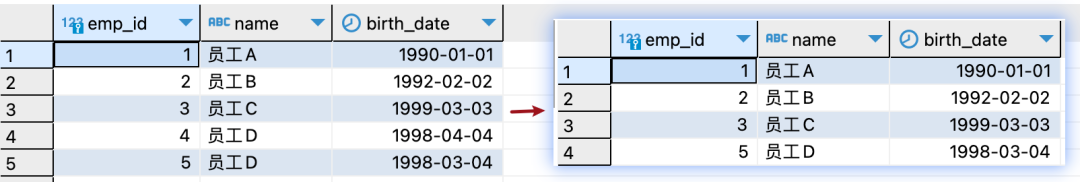 然而,这种方法的可行性取决于表中是否存在一个唯一标识每条记录的字段,也就是,一个数据不重复的字段,例如employees表中的emp_id字段。若表中不存在此类字段,该方法则无法适用。