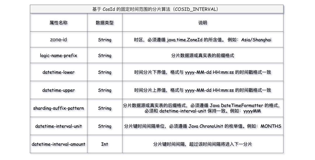 基于 CosId 的固定时间范围的分片算法,和INTERVAL算法的用法很相似,不同点在于增加了zone-id时区属性,logic-name-prefix分片数据源或真实表的前缀格式,上下界datetime-lowerdatetime-upper范围的时间格式是固定的yyyy-MM-dd HH:mm:ss