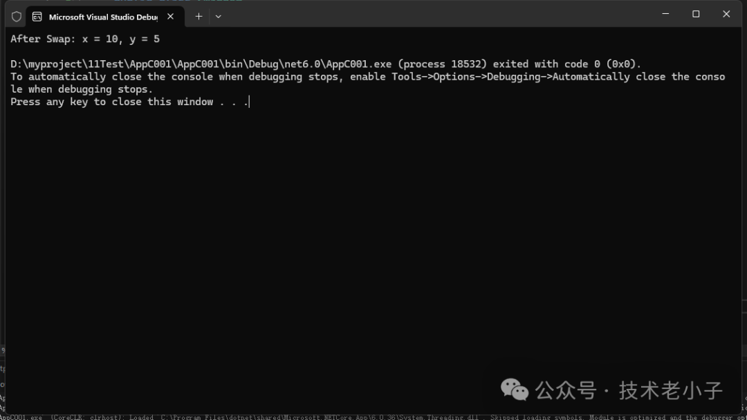 Console.WriteLine($"After Swap: x = {x}, y = {y}"); // 输出: x = 10, y = 5