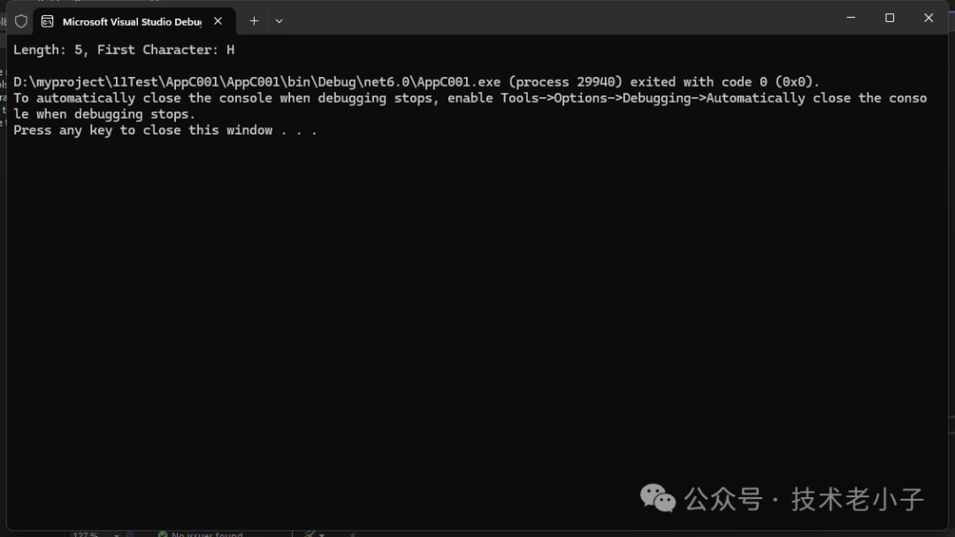 Console.WriteLine($"Length: {len}, First Character: {first}");