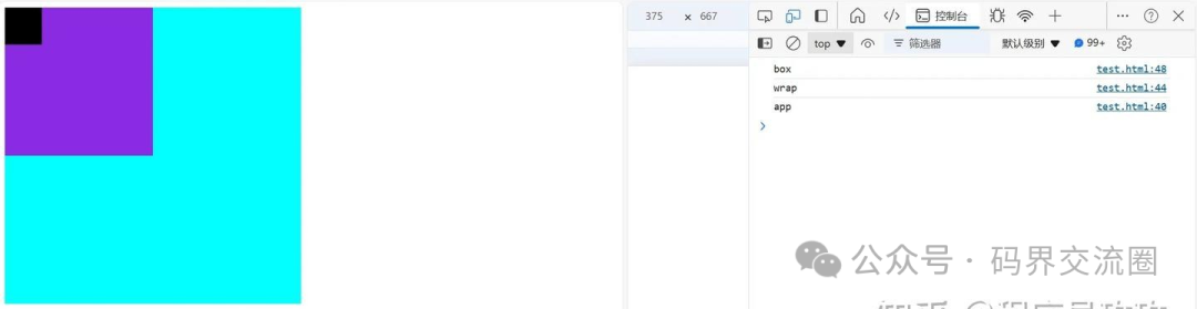 <!DOCTYPE html><html lang="en"><head>    <meta charset="UTF-8">    <meta name="viewport" content="width=device-width, initial-scale=1.0">    <title>Document</title>    <style>        #app{            width: 400px;            height: 400px;            background-color: aqua;        }        #wrap{            width: 200px;            height: 200px;            background-color: blueviolet;        }        #box{            width: 50px;            height: 50px;            background-color: black;        }    </style></head><body>    <div id="app">        <div id="wrap">            <div id="box">            </div>        </div>    </div>    <script>        let app = document.getElementById('app');        let wrap = document.getElementById('wrap');        let box = document.getElementById('box');        app.addEventListener('click',() => {             console.log('app');        },)        wrap.addEventListener('click',() => {            console.log('wrap');        },)        box.addEventListener('click',() => {            console.log('box');        },)    </script></body></html