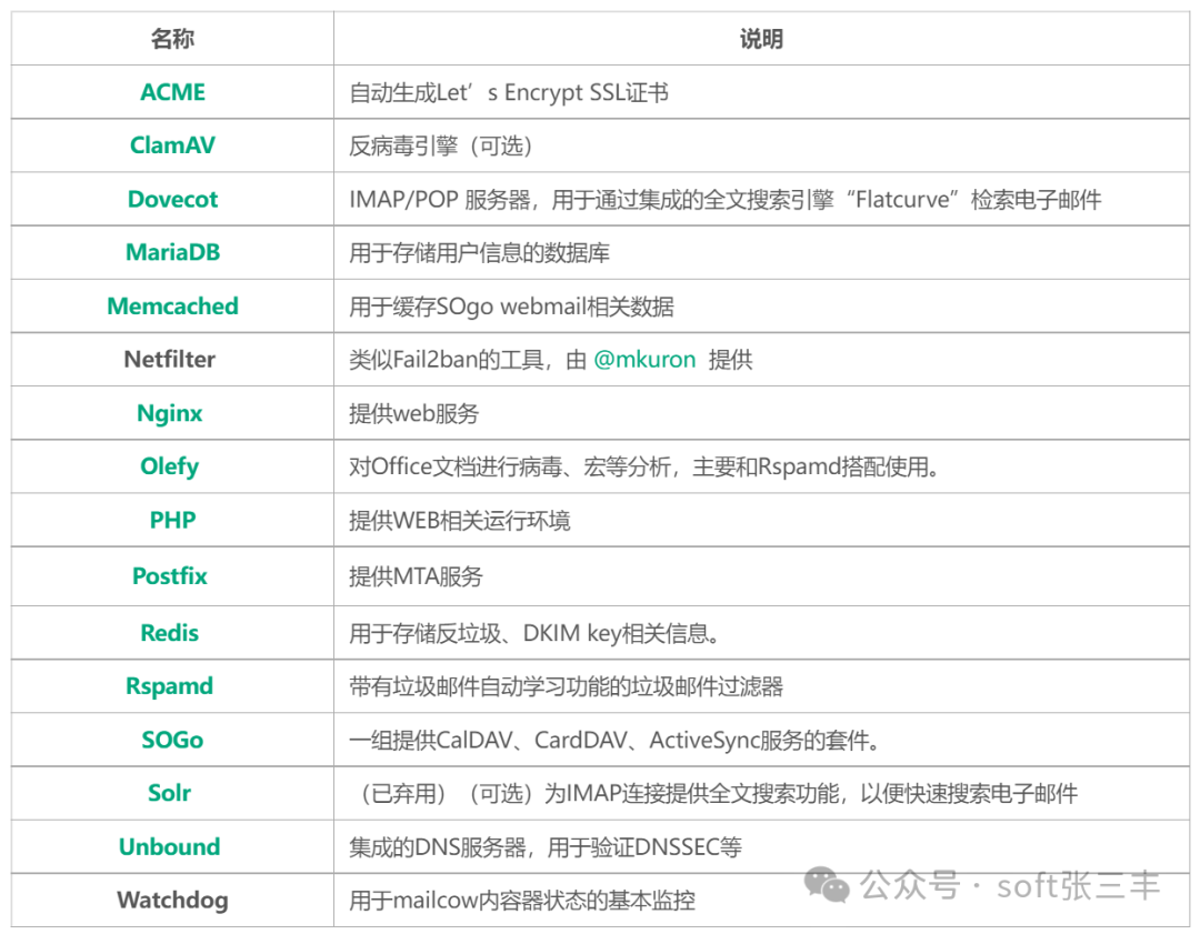 介绍Mailcow 是一个功能丰富的开源邮件服务器解决方案,它集成了多种邮件服务,如 SMTP、IMAP、POP3、Webmail、Antispam、Antivirus、DKIM、DMARC、SPF 等,并提供了友好的 Web 界面进行管理。Mailcow 支持多域名和多用户,非常适合个人和企业使用。 涉及的开源组件如下: