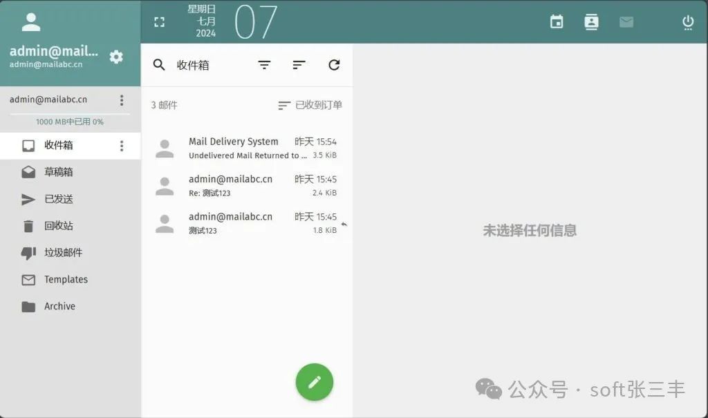 在这里可以设置域名、账号等等参数。 为了便于测试,我创建了一个邮件账号admin@mailabc.cn,登录webmail界面(入口是:https://domain/SOGo/)做一下邮件发送测试: webmail登录界面:
