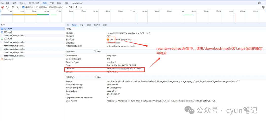 请求:GET http://192.168.1.166:86/download/mp3/001.mp3,响应:200 /music/001.mp3,这里状态码是200而不是3打头的重定向,效果类似于代理。