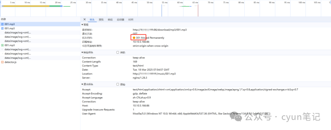 请求:GET http://192.168.1.166:86/download/mp3/001.mp3,响应:301 http://192.168.1.166:86/music/001.mp3