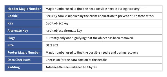 每个刀片服务器提供大约10TB的存储能力,使用了硬件 RAID-6, RAID 6在保持低成本的基础上实现了很好的性能和冗余。不佳的写性能可以通过RAID控制器和NVRAM缓存回写解决,写由于读取大多是随机的,NVRAM缓存是完全用于写入的。 文件系统 Haystack 对象库是建立在10TB容量的单一文件系统之上。 图片读取请求需要在读取系统调用这些文件的位置偏移,但是为了执行读取操作,文件系统必须先找到实际物理卷上的数据。文件系统中的每个文件都被一个叫做inode结构标识。inode包含了一个磁盘上逻辑文件偏移和物理区块偏移的映射。在使用的特殊类型文件系统时大文件块映射可能相当大。 基于文件系统的区块为给个逻辑区块和大文件保存映射。这些信息通常不适合保存在inode的缓存中,而是存储在在间接地址块。所以在读取文件的时候必须按照特定的流程。这里可以多个是间接地址块,所以一个读取会产生多个I/O取决于是否间接地址块被缓存。 该系统只为连续范围的区块保持映射。一个连续的大文件的块映射可以只由一个范围的标识,这样是适应inode的系统需求的。但是,如果该文件是一个被切割的不连续的块的话,他的块地图可能非常的大。以上可以通过文件系统主动为大的物理文件分配大块的空间来减少碎片。 目前使用的文件系统为XFS,一个很大程度提供高效的文件预分配系统。 Haystack 对象存储 Haystack 是一个简单的日志结构(只能追加),存储着其内部数据对象的指针。一个 Haystack 包括两个文件,包括指针和索引。下面的图片将描述haystack存储文件的布局: haystack最前面的8K存储是被超级块占用。紧随超级块是针,每针组成的一个头部,数据和尾部: 一个针被他的 在haystack存储文件中有每针相应的的索引记录,并且包含针索引记录的顺序必须和haystack存储文件相关的针的顺序相匹配。按照规定索引文件的最低需求是找到一个特定的针在haystack存储文件的元数据。载入和组织索引记录到一个有效的查找数据结构是Haystack程序的责任。索引文件是不是很关键,因为如果需要它可以从haystack存储文件重建。索引的主要职责是让针元数据无需通过较大的Haystack存储文件,快速加载到内存中。原因是其可以让索引编程原来存储的1%。 Haystack 写操作 Haystack 写操作同步将指针追加到 haystack 存储文件,当指针积累到一定程度,就会生成索引写到索引文件。由于索引文件是不是很关键,为了能有更快的性能所以采用异步的方式进行写入。 为了降低硬件故障带来的损失,索引文件还会定期写到存储空间中。在崩溃或突然断电的情况下,将haystack恢复处理器存储中任何残缺的针和截断haystack存储中最后一个有效的针。接下来,它会把丢失的针的索引记录 写到haystack文件的最后。 Haystack不允许重写现有的针偏移,如果一个针数据需要被重写,那么新版本必须使用相同的 Haystack 读操作 传到 haystack 读操作的参数包括指针的偏移量,健,备用键,Cookie 以及数据大小。Haystack为数据大小添加头部和尾部的长度,然后根据数据尺寸从文件中读取整个指针。读取操作成功的关键就是作为参数传递的健,备用键,Cookie是否匹配,数据是否通过了校验,并且针没有被删除掉。 Haystack 删除操作 删除操作比较简单 – 只需要在 Haystack 存储的指针字段中的“删除”位标记一下即可。并且,相关的索引记录不会做任何的修改。是最终的应用程序引用到的是一个删除的针。像这样一个读取删除针的操作将会返回一个相应的错误给应用程序。空间对已删除的针不做任何的回收,只有这样,才能使 haystack 的空间非常的紧凑。 照片存储服务器 照片存储服务器负责接受 HTTP 请求,并转换成相应的 Haystack 操作。为了尽量减少服务器检索照片时的I/O操作,该服务器维护着全部 Haystack 中文件索引的缓存。服务器启动时,系统就会将这些索引读到缓存中。由于每个节点都有数百万张照片,必须保证索引的容量不会超过服务器的物理内存。在内存中仅需要保存查找照片所需的少量元数据即可。 对于用户上传的图片,系统分配一个64位的独立ID,照片接着被缩放成4种不同尺寸,每种尺寸的图像拥有相同的随机 Cookie 和64位的密钥,图片尺寸描述(大,中,小,缩略图)被存在代用key 中。接着上传服务器通知照片存储服务器将这些资料连同图片存储到 haystack 中。 每张图片的索引缓存包含以下数据: 由于Google的开源 sparse hash data 结构对于每个条目只有2bit的开销,所以Haystack使用它来保证内存中的索引缓存尽可能小。 照片存 储的写/修改操作 写操作将照片数据写到 Haystack 存储并更新内存中的索引。如果该索引记录中包含了相同的键,那么这是一次对现有的照片进行修改的操作。并且只要修改索引记录中的偏移来反应新图像在haystack存储文件的位置。照片存储始终假定,如果有重复的图像(图像具有相同的键),有较大的偏移量的那个存储是有效的。 照片存储的读操作 传递给一个读操作的参包括Haystack ID,照片的 Key, 尺寸以及 Cookie。服务器事先在缓存中按照照片的Key和所需文件的偏移进行查找。如果找到了它,并向haystack发出读取词图像的请求。按照上面说的,haystack的删除操作并不更新它的索引记录,因此添加到内存中的索引可以包含以前删除的照片的内容。当阅读以前的删除的照片失败后,系统将在内存的索引中色绘制词图片的