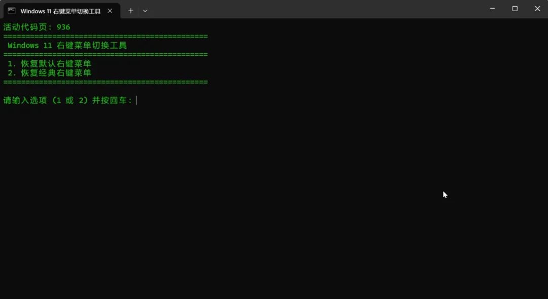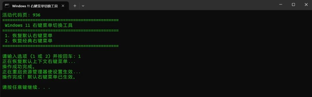 如果在使用过程中,你想将右键菜单再变回Windows 11的样式,只需重新打开工具,选择 “1、恢复默认右键菜单”,回车即可完成切换。