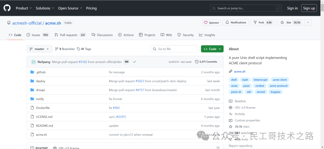 acme.sh 是一个知名的用于申请 Let's Encrypt 证书的开源项目,项目地址:https://github.com/acmesh-official/acme.sh,也是属于脚本类型,有比较详细的文档,支持自动化更新和自动化部署。