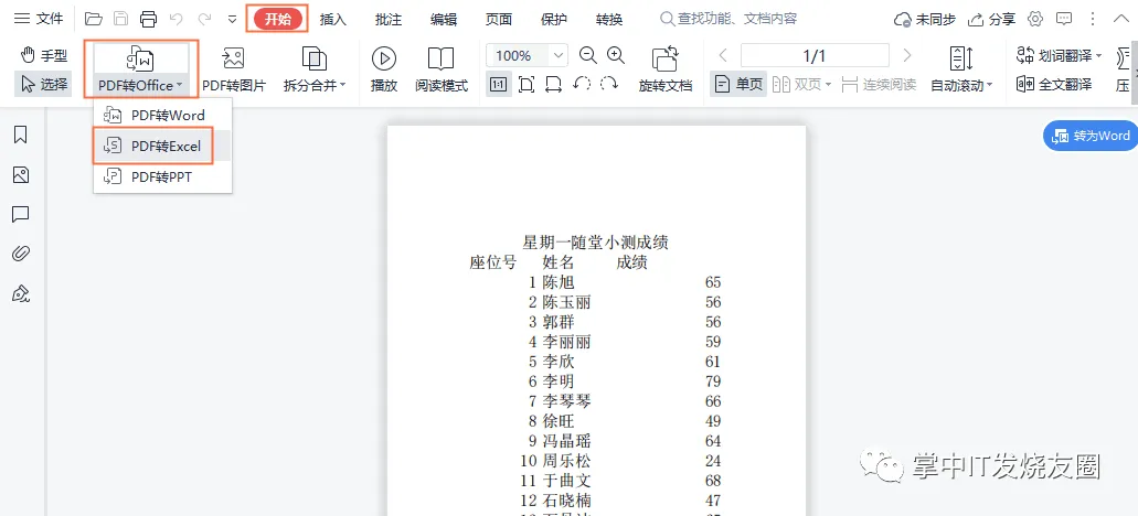 用WPS打开PDF文档,在【开始】下面点击【PDF转office】,然后选择【PDF转Excel】,点击【开始转换】即可。
