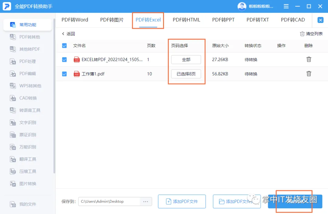 打开软件,点击【PDF转其它】,选择【PDF转Excel】,然后添加文件,选择要转换的页面,然后点击【开始转换】就可以了。