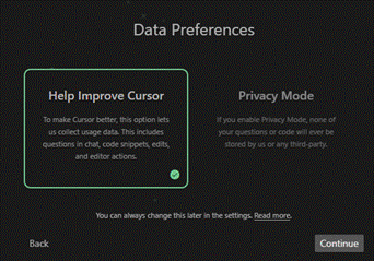 ④数据选项:若勾选前一选项,平台会收集使用数据以对软件进行优化;若选择隐私模式,个人问题或者代码则不会被平台方或者其他第三方机构储存。这里根据个人工作需要进行选择即可。