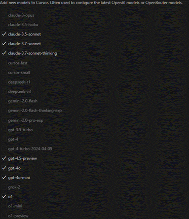 Cursor爆火原因之一就是内置了许多功能强大的AI模型,诸如claudeGPT-4Deepseek等,这里我们可以根据具体需要选取合适的模型。