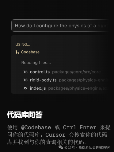 使用 @Codebase 或 Ctrl Enter 来提问你的代码库。Cursor 会搜索你的代码库并找到与你的查询相关的代码。