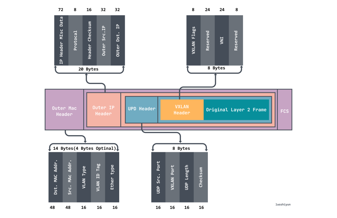 2. UDP头:VXLAN使用UDP协议进行封装,默认使用端口4789。UDP头包含源端口和目的端口信息。
