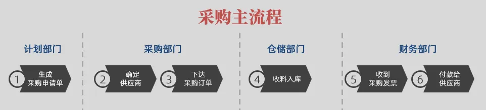 如上图所示,对于制造企业来说,一条采购主流程一般会包括六个步骤。