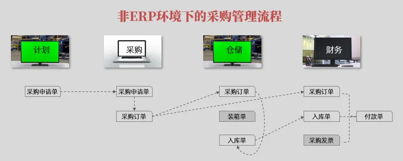 比如对于非ERP环境下的采购流程来说,首先申请部门要填写采购申请单,然后要把申请单复制一份递交给采购部门。采购部门生成采购订单以后,要下达给供应商,同时要把采购订单复制两份,一份给仓库用于收料入库,另一份要给财务部门用于付款。仓库办理完收料入库之后,要生成入库单,并且把入库单复制一份给财务部门。最后是财务接收采购发票,付款给供应商以后,要生成付款单。