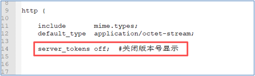 打开nginx.conf配置文件,将server_tokens off;添加在http { … } 配置块内;默认无该配置项,需要手动添加。