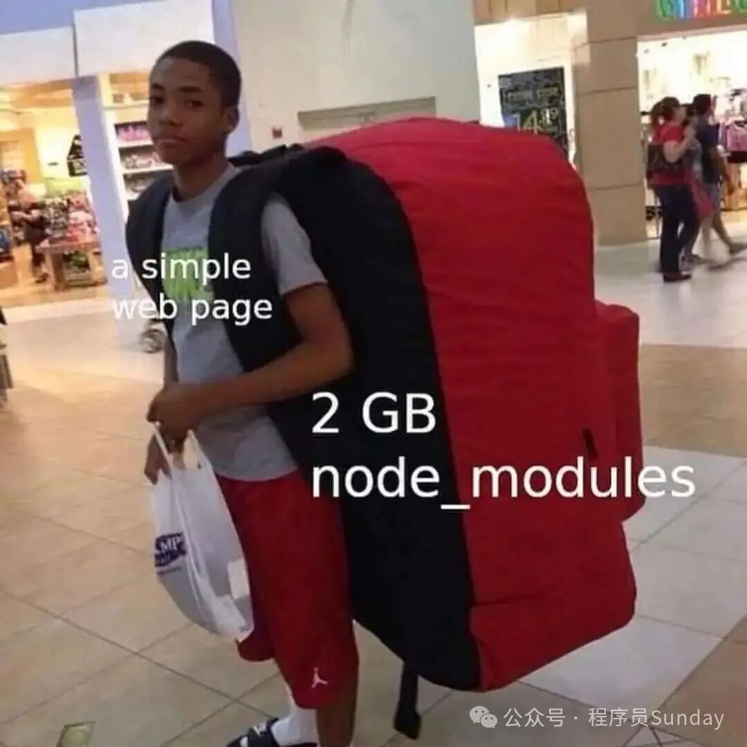 弄到现在,做个小功能,都得引入一大堆的库才行,各种依赖导致出现各种巨大的 node_modules。不知道还有多少同学记得下面这张图...