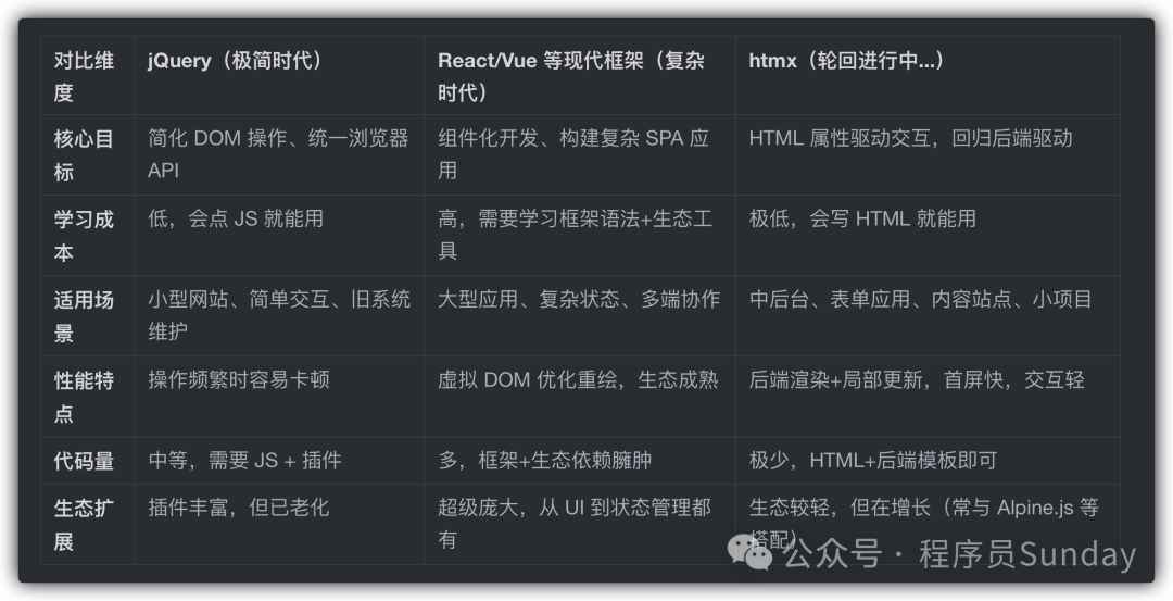 说到这,咱们不妨把 jQuery、现代框架、htmx 放在一起横向对比一下,看看它们各自的定位: