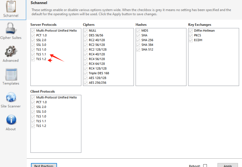 勾选对应的1.2,取消掉1.0,1.1点击Apply 重启服务器(sqlserver是连接不上的会提示错误的,要安装sqlserver对应的补丁 才支持TLS1.2)