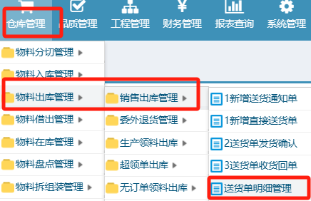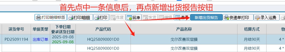 在送货单界面,点中一条信息后,再点出货报告