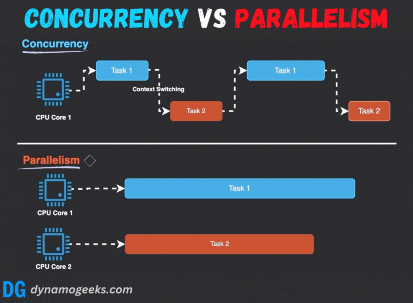 • 指系统在一段时间内管理多个任务的能力。并发关注任务的协调与交错执行,通过时间分片等技术在一个或多个处理器上实现,因此并发看似同时进行,但不一定在同一时刻执行。