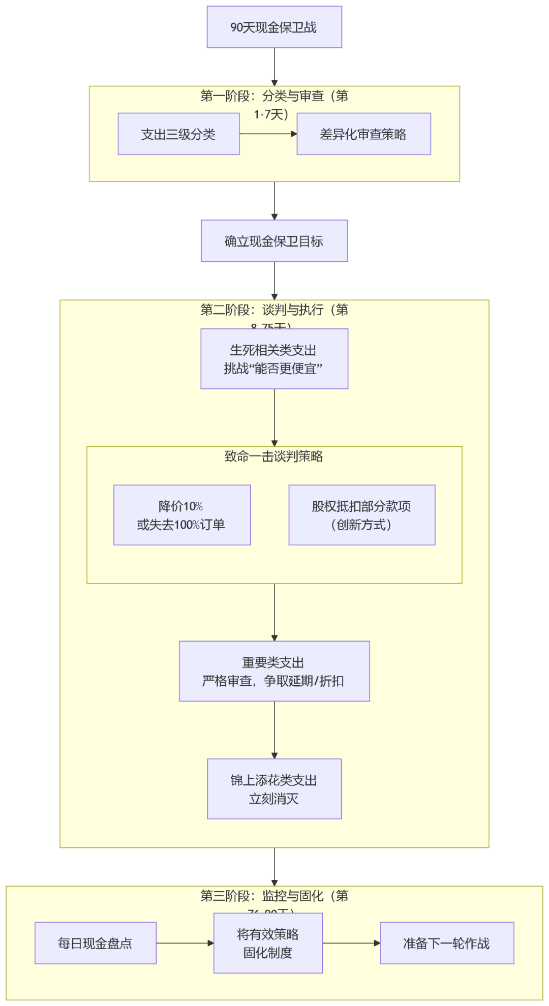 将所有支出分类为“生死相关”、“重要”、“锦上添花”。立刻消灭第三类,严格审查第二类,即便是第一类也要挑战“能否更便宜”?谈判策略:对供应商直言“降价10%或失去我们100%订单”,通常有效;甚至可尝试“用股权抵扣部分款项”的创新方式。