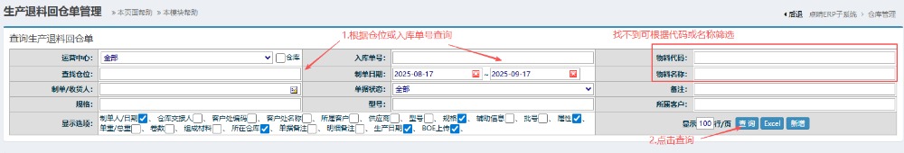 5.提交后,回到左侧的功能菜单找到“生产退料回仓单入库”。
