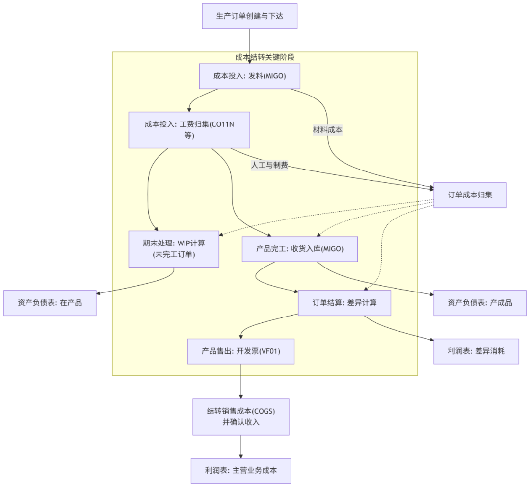 整个流程围绕着**生产订单(Production Order)** 的生命周期展开,如下图所示,它清晰地展示了成本从投入、归集到最终结转的完整路径: