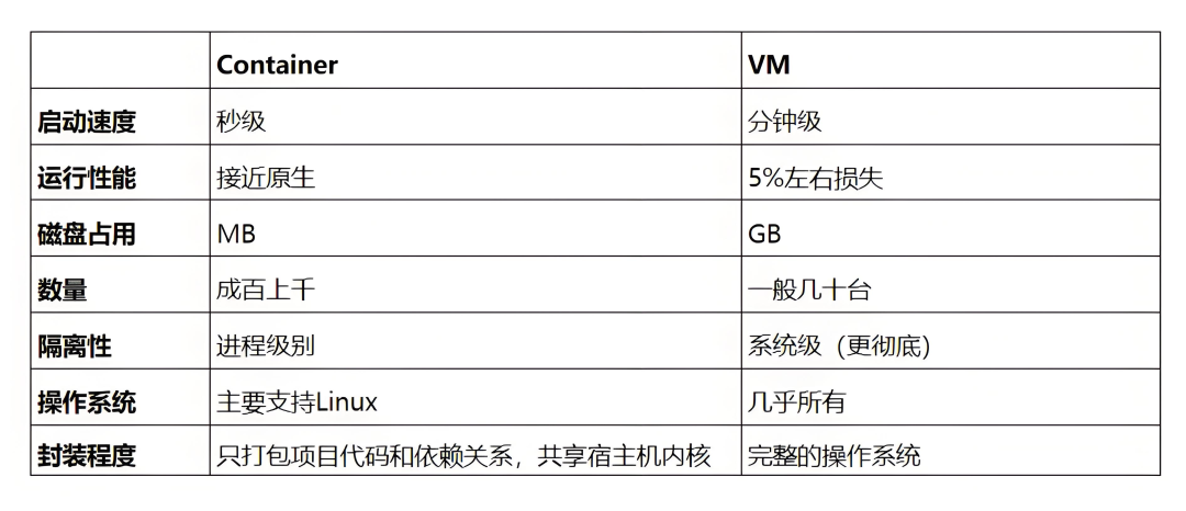 - 虚拟机因 Hypervisor 指令转换与硬件模拟,存在 5%-15% 的性能损失。