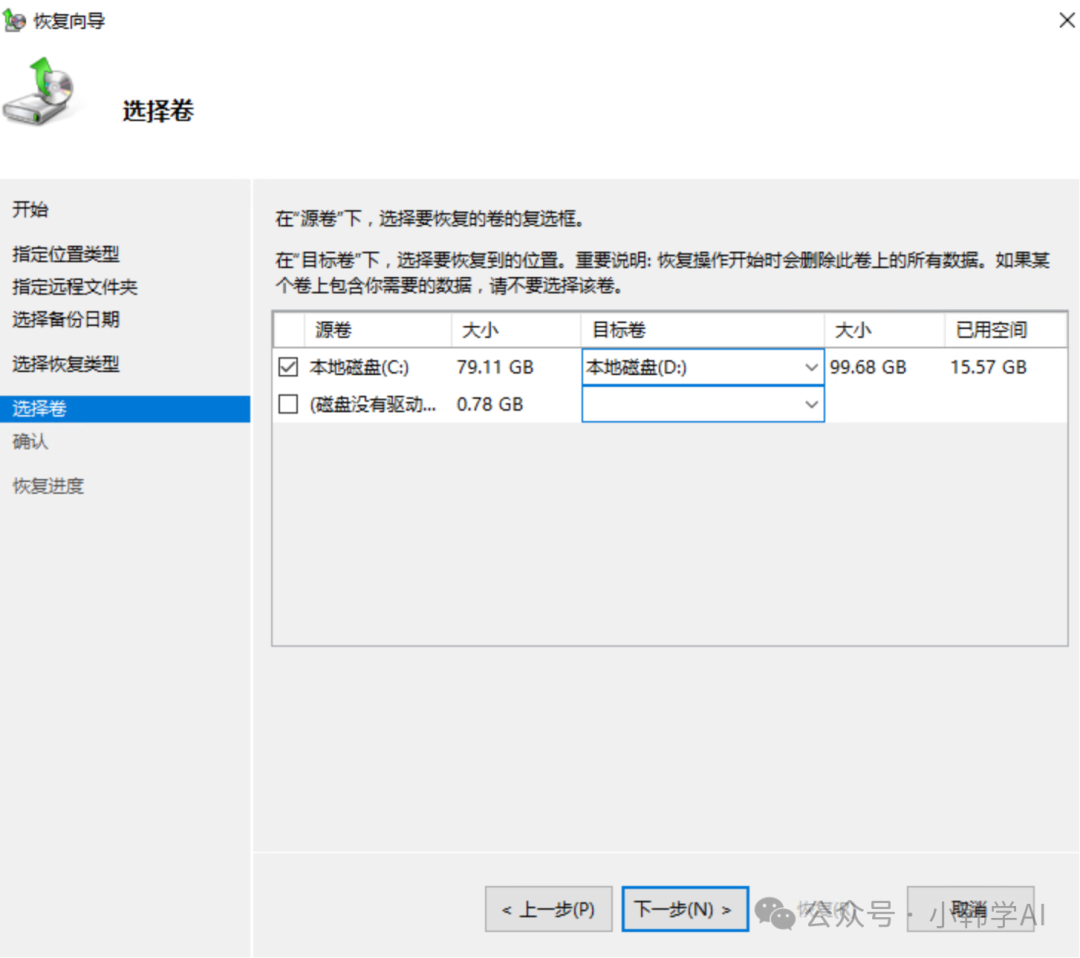安装window server backup功能模块windows server默认安装没有backup 模块,需要安装功能模块选择本地所在地,本机或者网络共享目录,我这里之前备份在网络共享目录下我这里选择把备份中的C盘分区卷,恢复到这台机器的d盘这种恢复方式无法恢复EFI引导分区,我们需要重建EFI分区如果你的需要恢复的硬盘已经有了efi分区,那么执行以下命令重建引导文件bcdboot d:\windows /s S: /f ALL