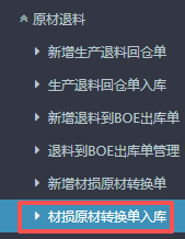 1.进入ERP系统之后,在左侧的功能菜单里找到“BOE定制”,点开“原材退料”,点击“新增材损原材转换单”。