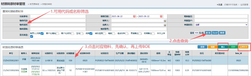 5.进入界面后,按图操作:可用代码或名称筛选物料,然后点击查询点击对应物料信息,先进行确认,再上传BOE