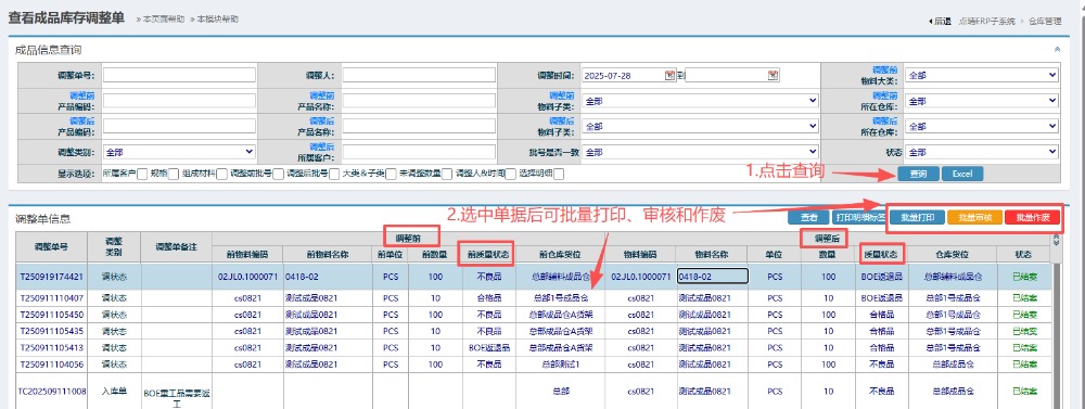 2.进入界面后,按图操作进行查找:先点击查询,然后可以确认当前物料的调整前后状态。根据情况选择批量操作(打印、作废和审核)