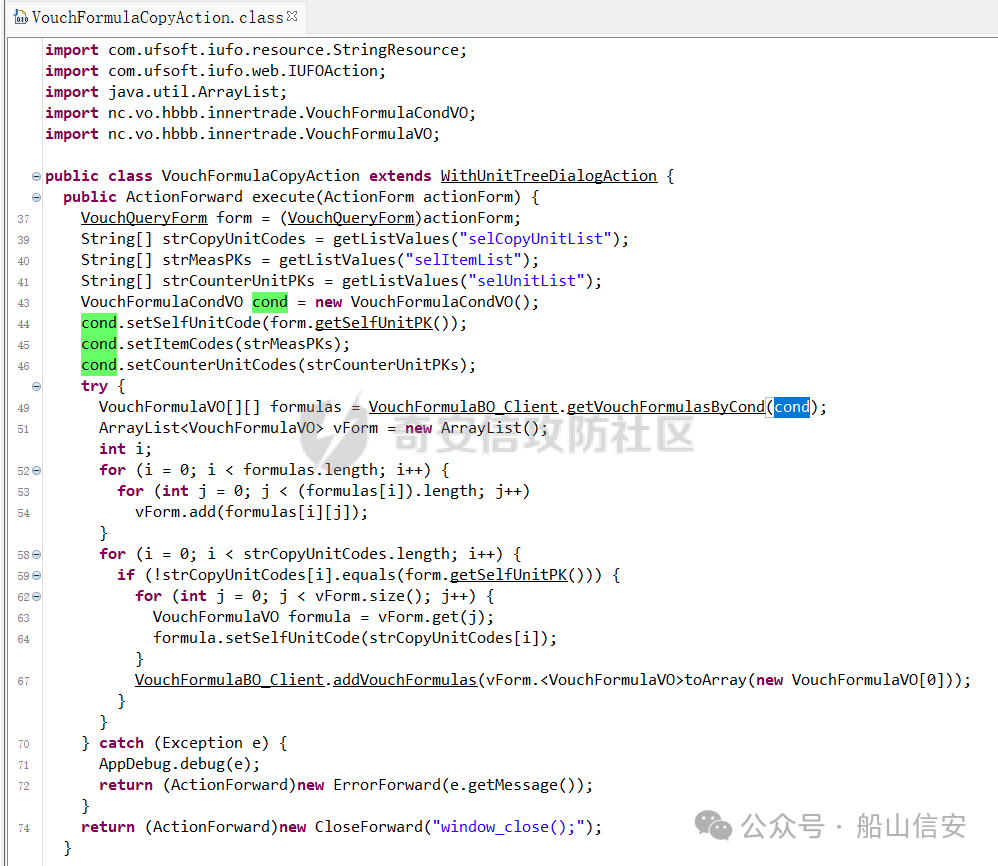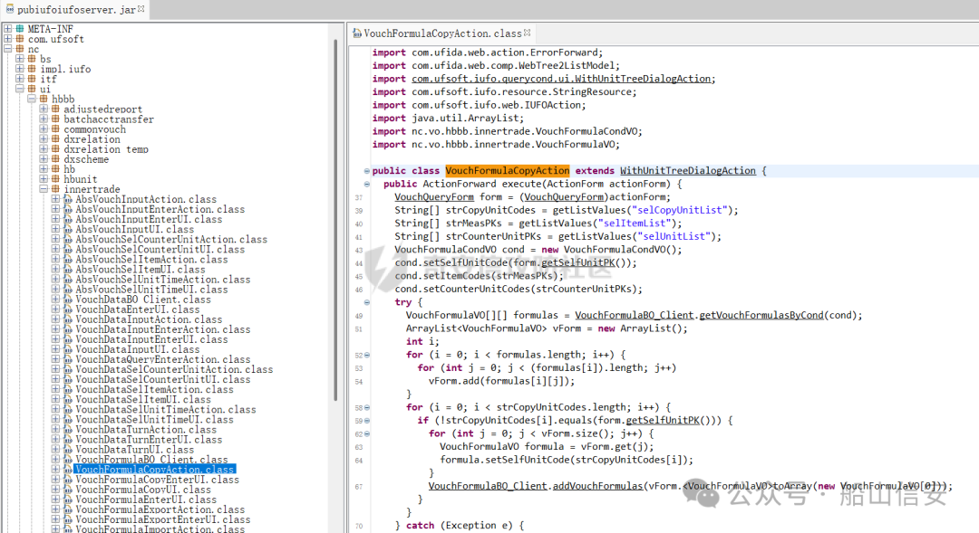 首先看漏洞位于VouchFormulaCopyAction接口处,方法的完整路径为nc.ui.hbbb.innertrade.VouchFormulaCopyAction,因为是Action方法,所以是按照用友的ActionServlet方法调用的方法漏洞